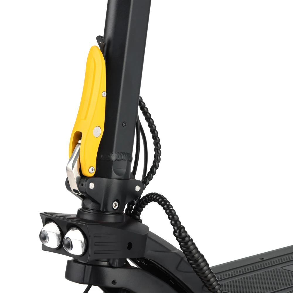 Двухлинзированная фара не только делает езду безопасной в темное время суток, но и добавляет стильный акцент к дизайну. Черно-желтая расцветка придает самокату современный и динамичный вид.