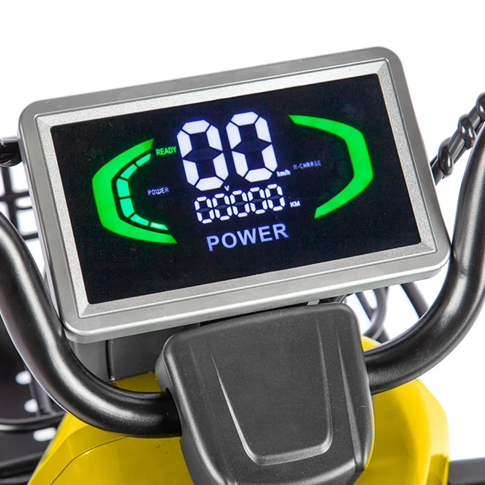 Электротрицикл Rutrike Топик желтый – техника представлена ярким дизайном. Востребована активными целеустремленными личностями, предпочитающими отдых на свежем воздухе. Также модель популярна в частном бизнесе и туристическом сервесе. Стальная конструкция рамы выдерживает максимальную грузоподъемность, не деформируется и не теряет первоначальных характеристик. Комфорт обеспечен широкими сиденьями из эко-кожи. Водительское сиденье анатомическое со спинкой и подлокотниками, исключает усталость и проблемы с позвоночником. В заднем сиденье имеется отсек для груза, может использоваться в качестве багажника. Мягкая платформа исключает отек ног. Мощность электромотора составляет 800 Вт. Батарея в комплектации отсутствует. Производитель предупреждает, что для данной модели трицикла необходимая емкость аккумуляторной батареи составляет 48 В и 60 В. Колесная часть – накатистая, 10-дюймовая, отлично сцепляется с разными видами поверхности. Наличие яркого светодиодного освещения, фирменных тормозов и зеркал заднего вида увеличивает степень безопасности езды, допускает эксплуатацию техники в вечернее время и непогоду. Для приобретения модели оперативно, по приемлемой цене предлагаем прямо сейчас сделать телефонный звонок нашему менеджеру или связаться с ним в чате.