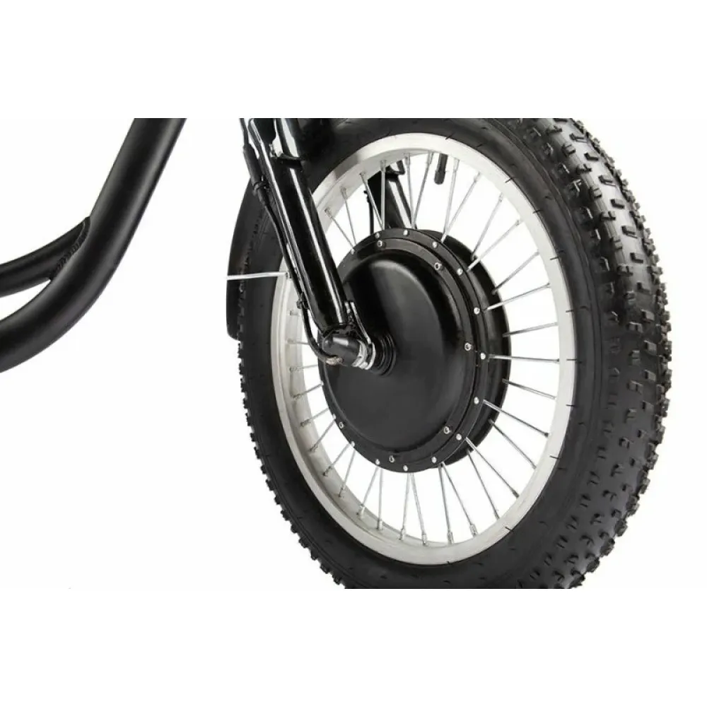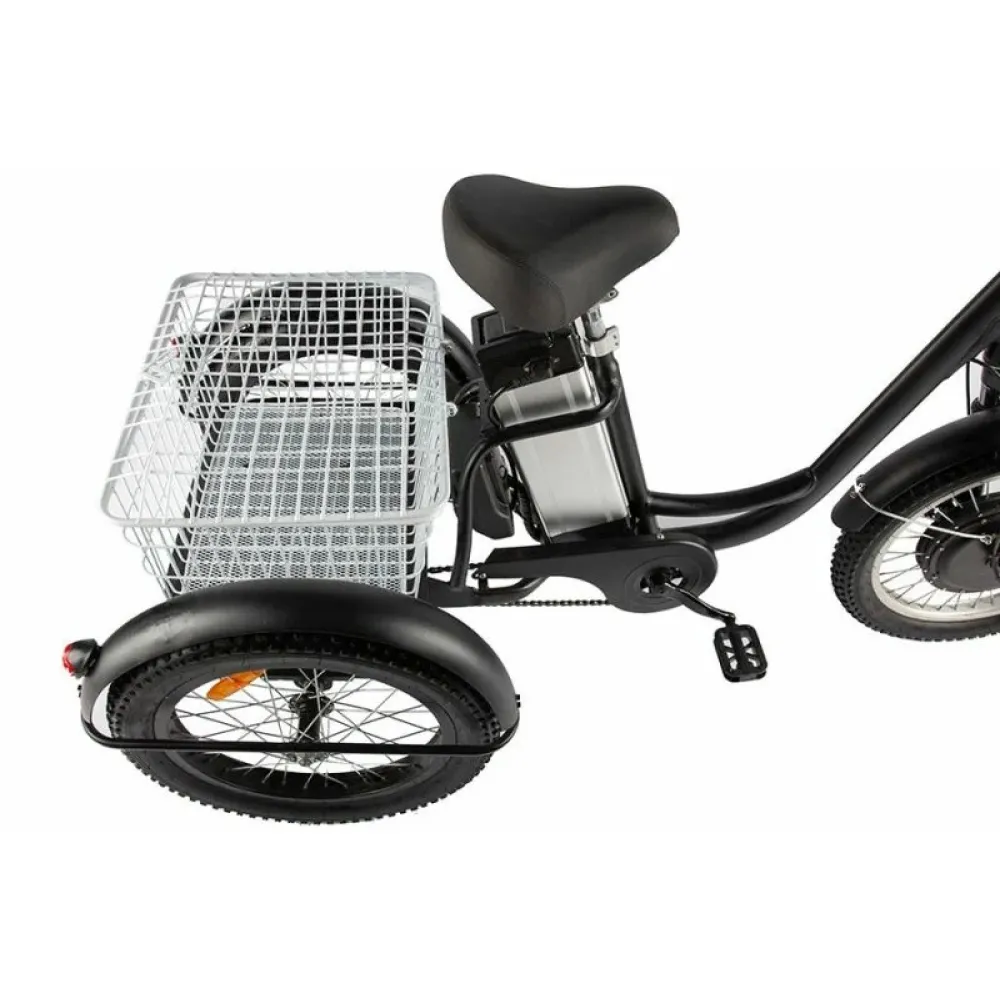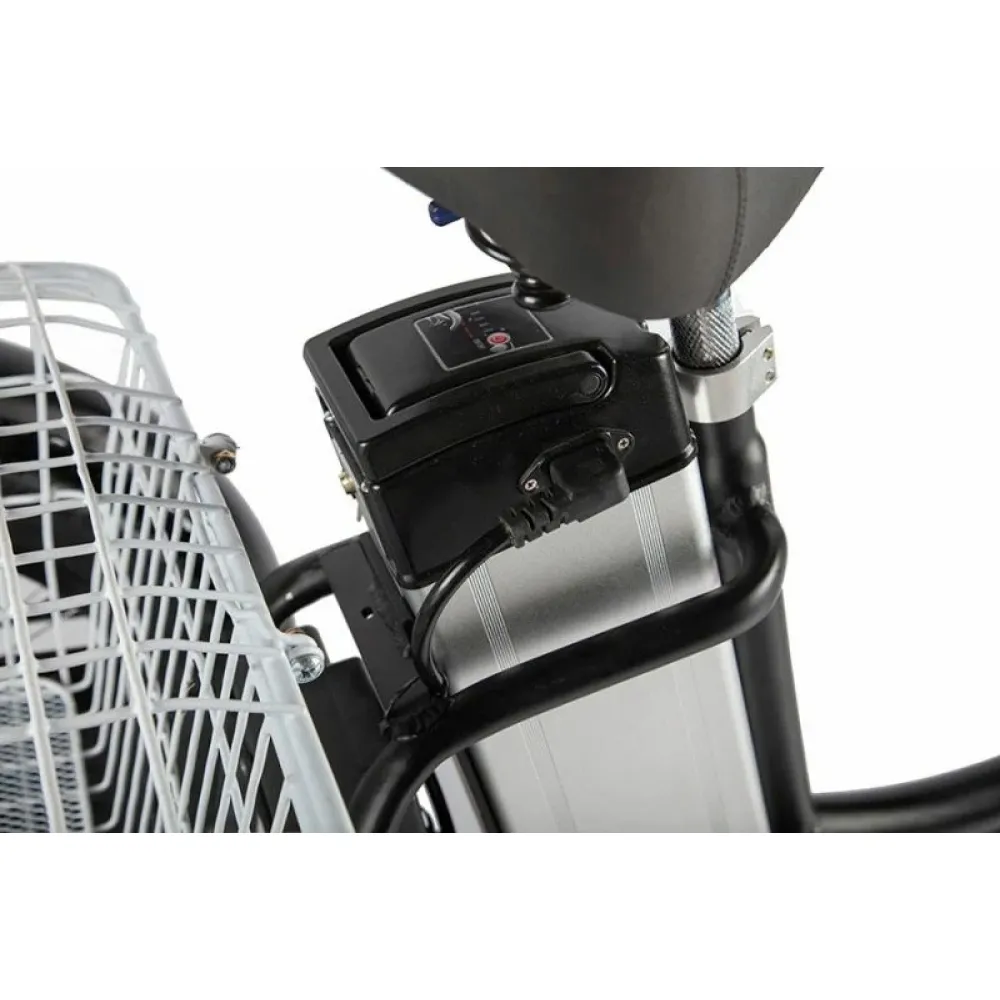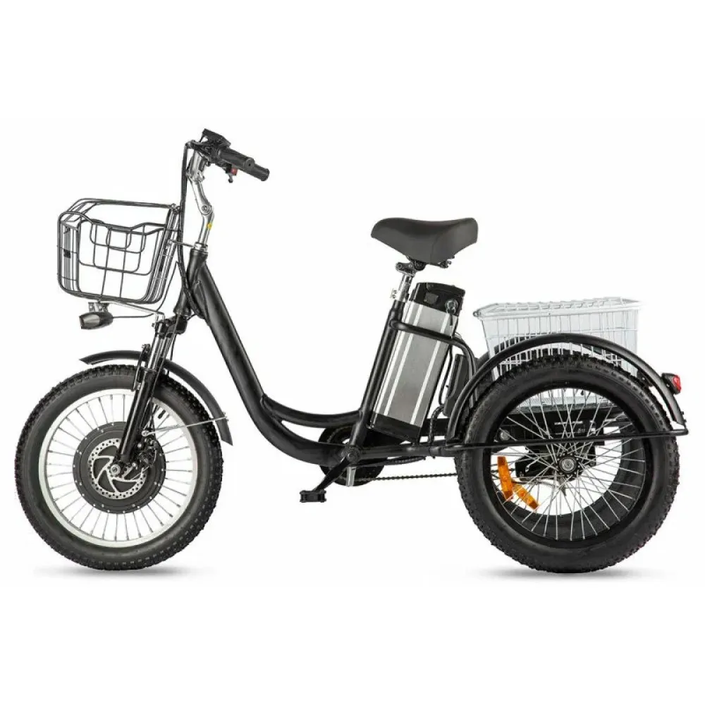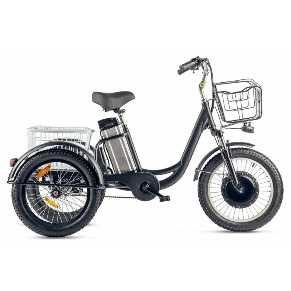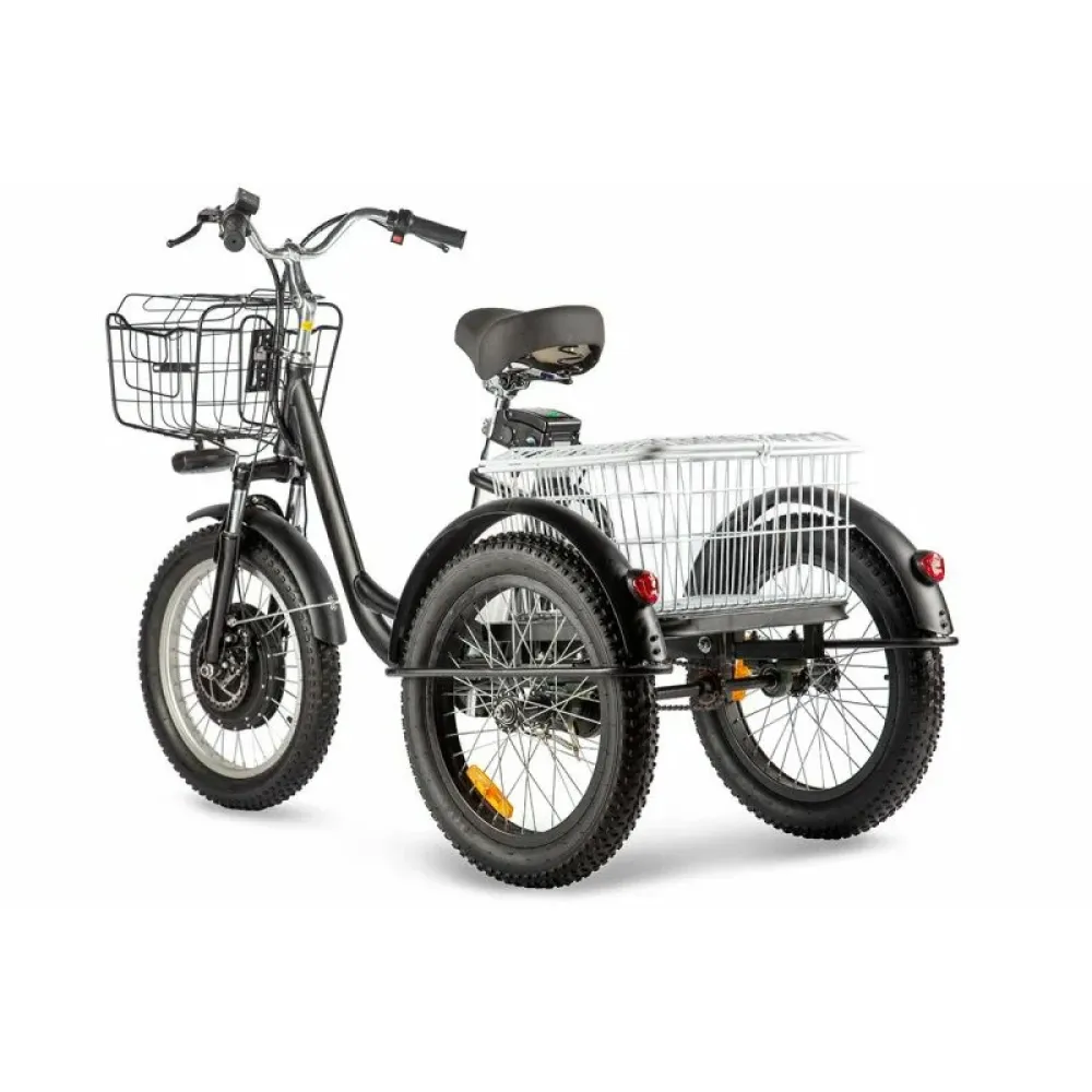 Трицикл имеет мощный электромотор c прямым приводом. Он легко справляется с препятствиями и неровностями на дороге благодаря амортизационной вилке. Ему не страшны снег, песок, грязь.