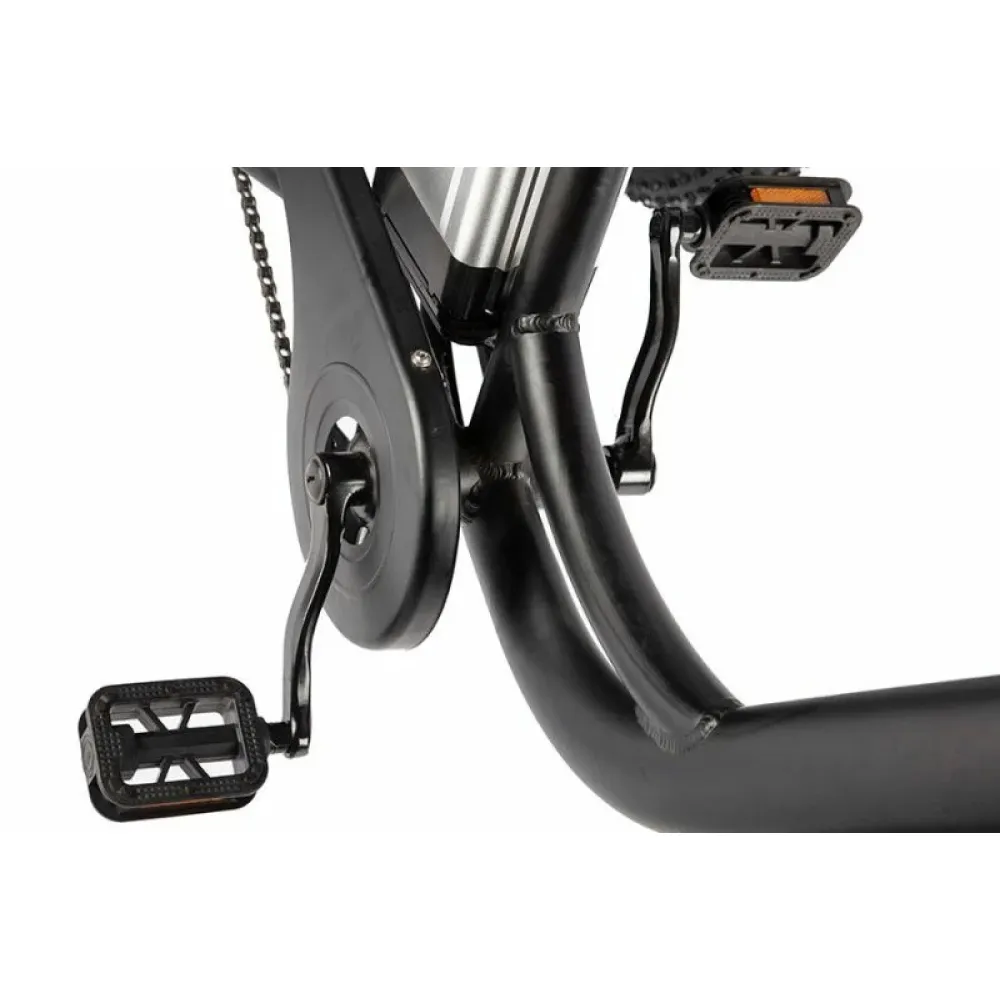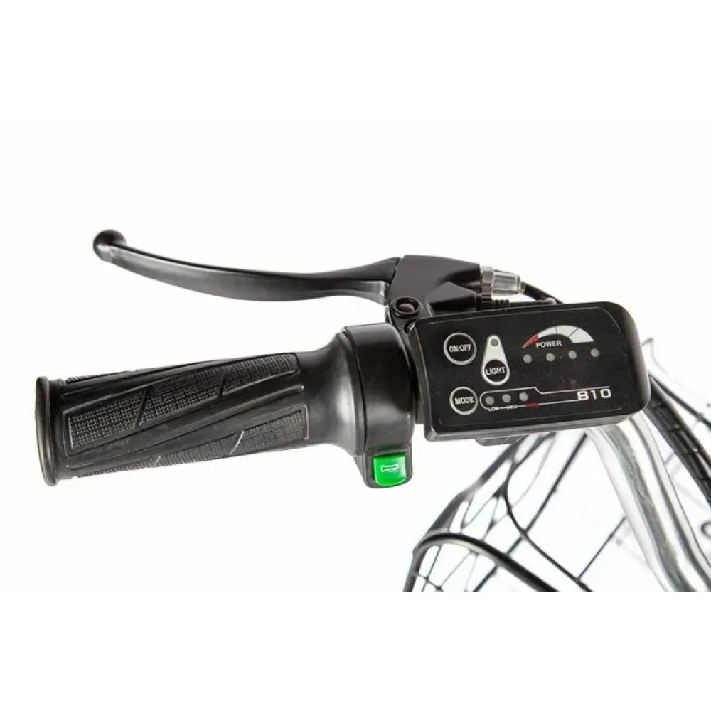 Работает от аккумуляторной батареи, которая долго держит заряд, можно проехать до 40 км. Имеет стильные светодиодные фары, стальные полноразмерные крылья. Впереди на руле расположена легкая корзина, сзади – большая вместительная.