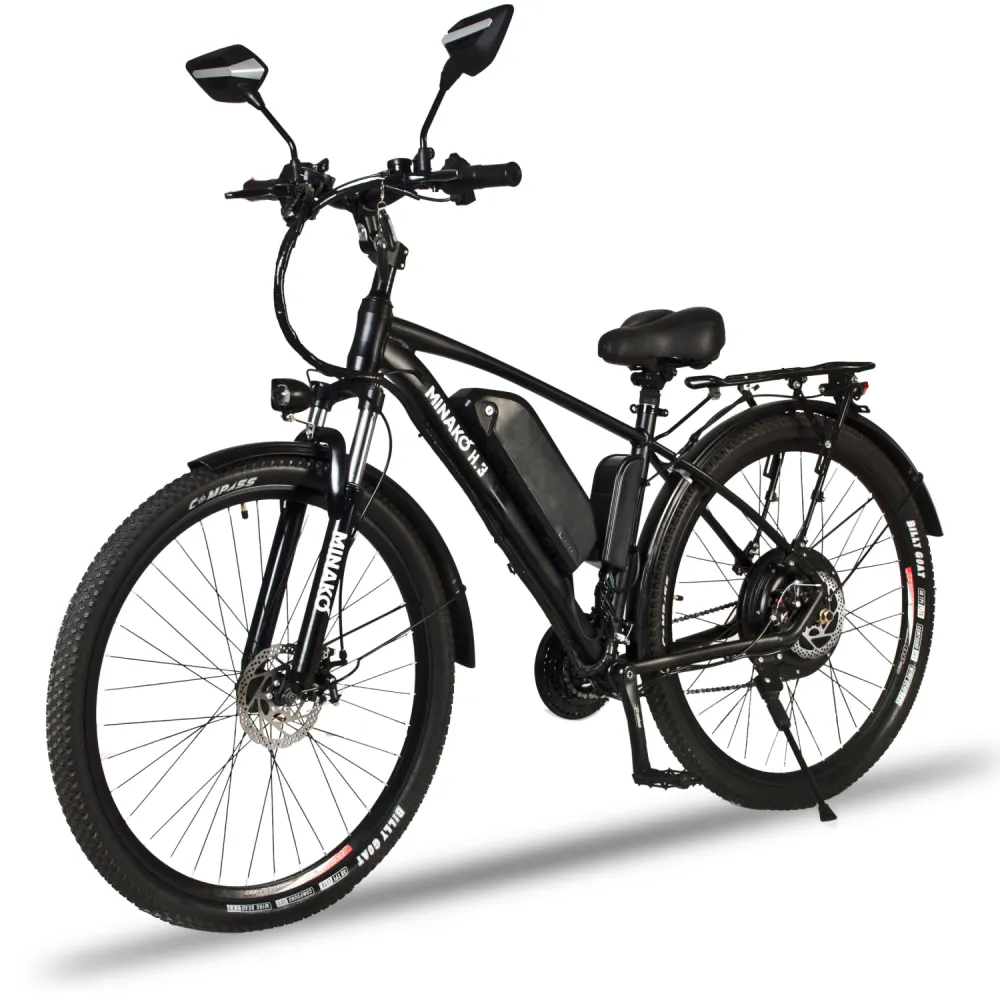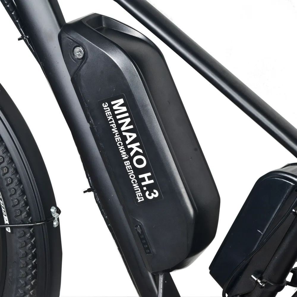 Велогибрид Minako H.3 представляет собой полноразмерный велосипед на 29-дюймовых колёсах. Рама велосипеда выполнена из алюминия, что позволило существо облегчить конструкцию, но никак не потерять в прочности, поэтому максимальная нагрузка – целых 120 килограмм. Аккумулятор крепится непосредственно посередине рамы. Такое решение увеличивает манёвренность и управляемость велогибрида.